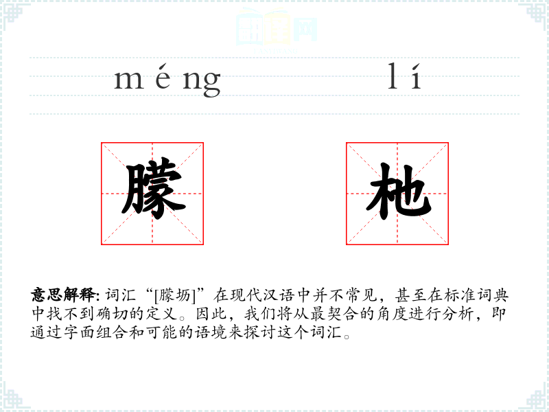 词汇“[朦坜]”在现代汉语中并不常见,甚至在标准词典中找不到确切的定义。因此,我们将从最契合的角度进行分析,即通过字面组合和可能的语境来探讨这个词汇。