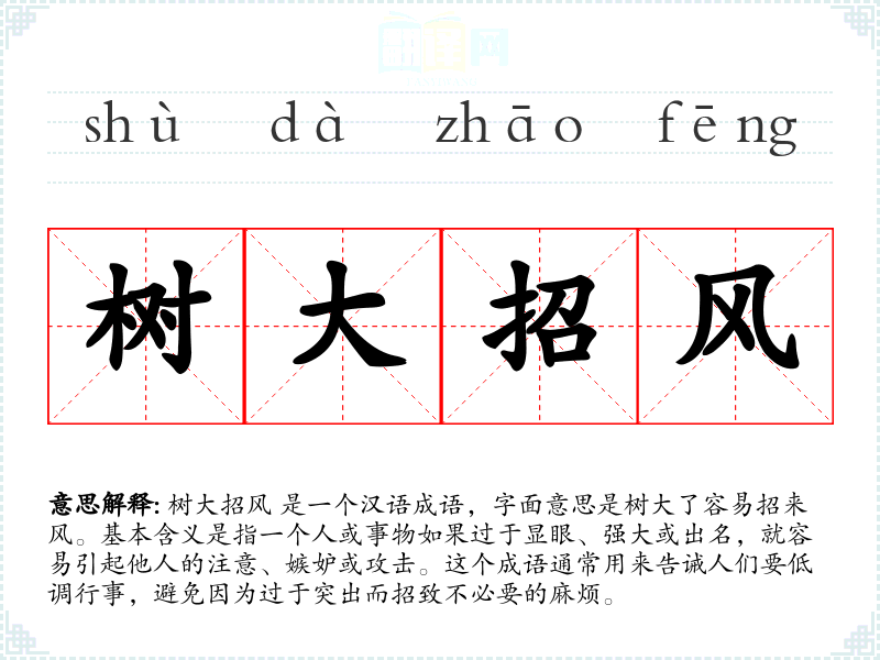 树大招风 是一个汉语成语,字面意思是树大了容易招来风。基本含义是指一个人或事物如果过于显眼、强大或出名,就容易引起他人的注意、嫉妒或攻击。这个成语通常用来告诫人们要低调行事,避免因为过于突出而招致不必要的麻烦。