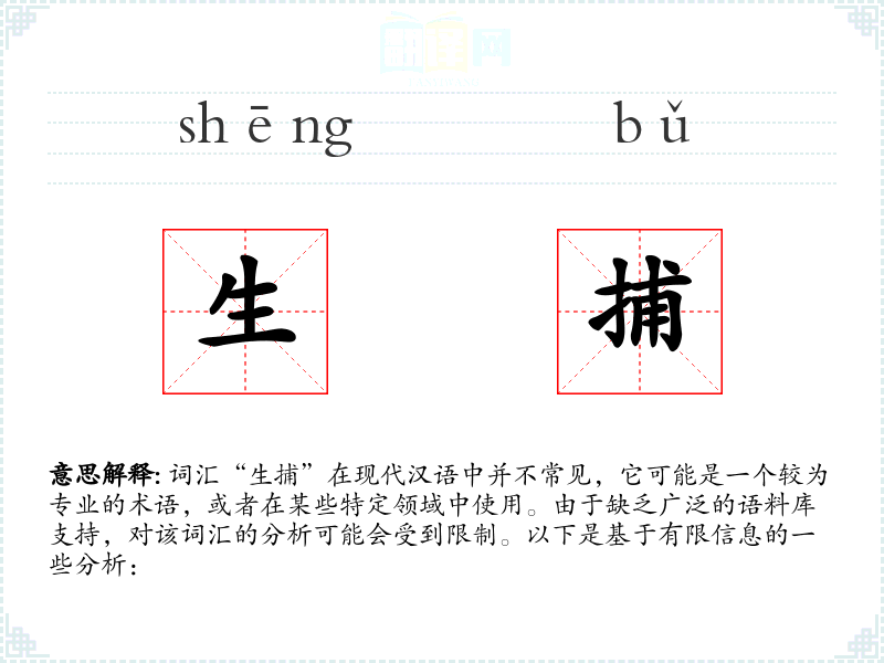 词汇“生捕”在现代汉语中并不常见,它可能是一个较为专业的术语,或者在某些特定领域中使用。由于缺乏广泛的语料库支持,对该词汇的分析可能会受到限制。以下是基于有限信息的一些分析: