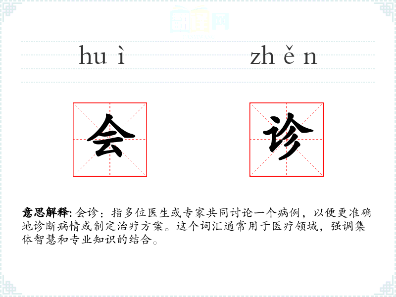 会诊:指多位医生或专家共同讨论一个病例,以便更准确地诊断病情或制定治疗方案。这个词汇通常用于医疗领域,强调集体智慧和专业知识的结合。