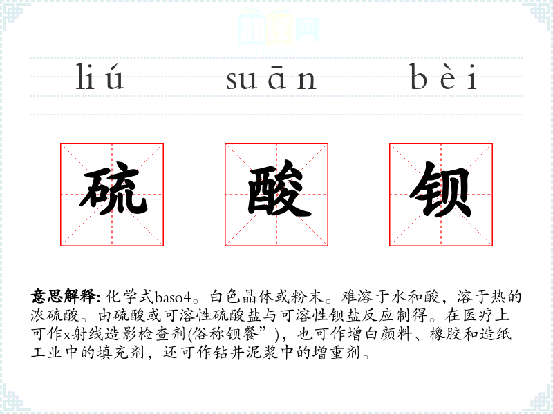 1.化学式baso4。白色晶体或粉末。难溶于水和酸,溶于热的浓硫酸。由硫酸或可溶性硫酸盐与可溶性钡盐反应制得。在医疗上可作x射线造影检查剂(俗称钡餐”),也可作增白颜料、橡胶和造纸工业中的填充剂,还可作钻井泥浆中的增重剂。