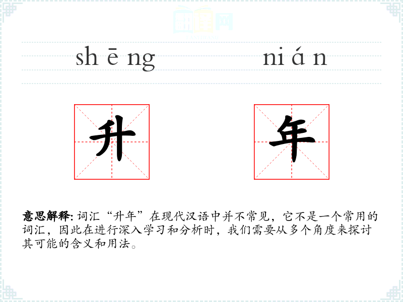 词汇“升年”在现代汉语中并不常见,它不是一个常用的词汇,因此在进行深入学*和分析时,我们需要从多个角度来探讨其可能的含义和用法。