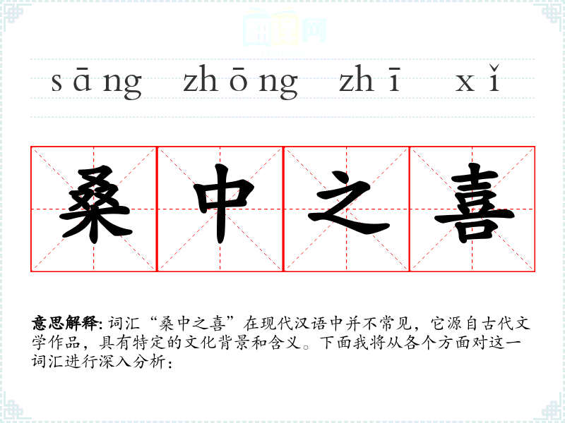 “桑中之喜”字面意思是在桑树之间的喜悦。这个词汇源自《诗经·小雅·桑扈》:“桑之未落,其叶沃若。于嗟鸠兮,无食桑葚!于嗟女兮,无与士耽!士之耽兮,犹可说也。女之耽兮,不可说也。”这里的“桑中之喜”指的是在桑树下发生的喜悦或欢乐的情景,通常与爱情或田园生活的美好时光相关联。