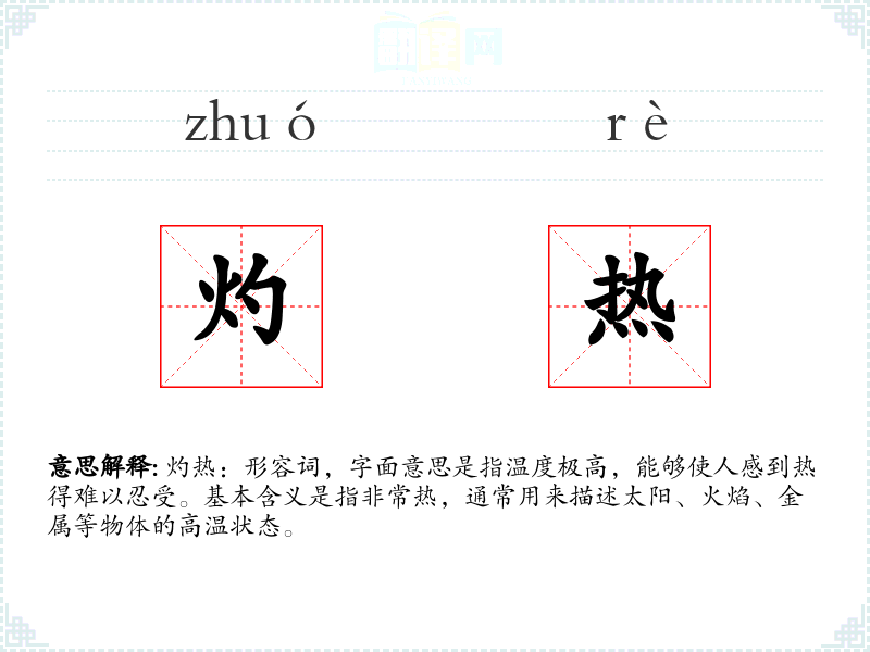 灼热:形容词,字面意思是指温度极高,能够使人感到热得难以忍受。基本含义是指非常热,通常用来描述太阳、火焰、金属等物体的高温状态。