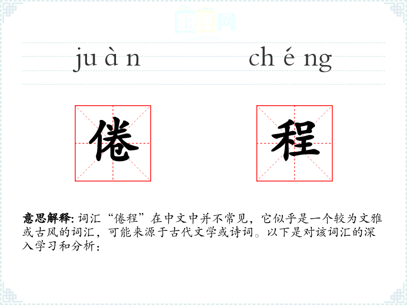 词汇“倦程”在中文中并不常见,它似乎是一个较为文雅或古风的词汇,可能来源于古代文学或诗词。以下是对该词汇的深入学*和分析: