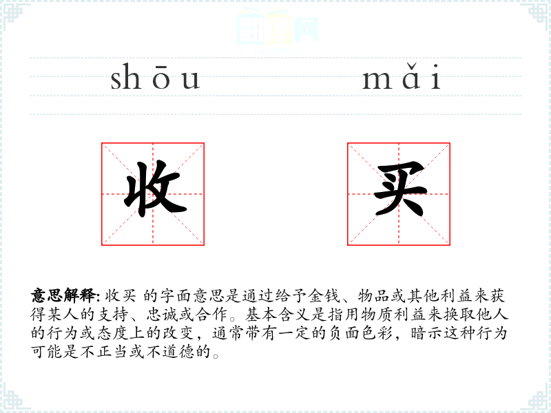 收买 的字面意思是通过给予金钱、物品或其他利益来获得某人的支持、忠诚或合作。基本含义是指用物质利益来换取他人的行为或态度上的改变,通常带有一定的负面色彩,暗示这种行为可能是不正当或不道德的。