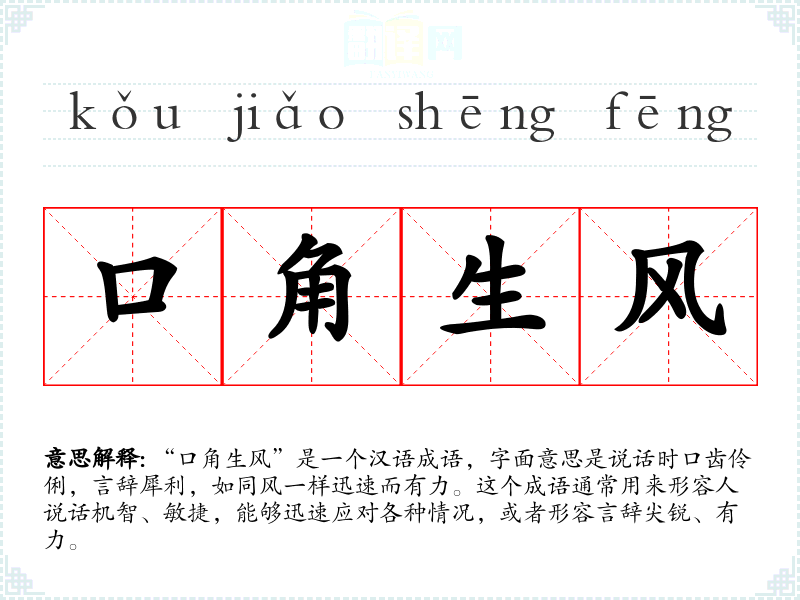“口角生风”是一个汉语成语,字面意思是说话时口齿伶俐,言辞犀利,如同风一样迅速而有力。这个成语通常用来形容人说话机智、敏捷,能够迅速应对各种情况,或者形容言辞尖锐、有力。