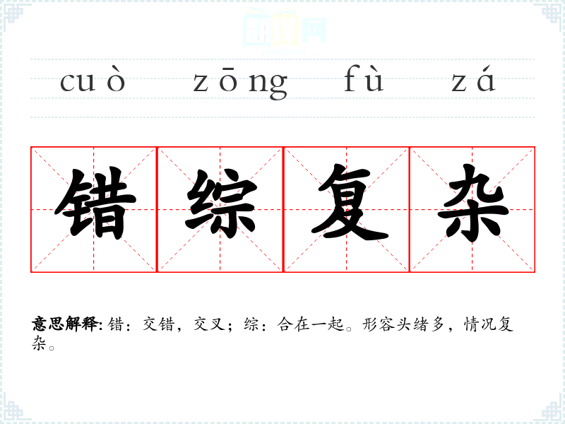 错:交错,交叉;综:合在一起。形容头绪多,情况复杂。