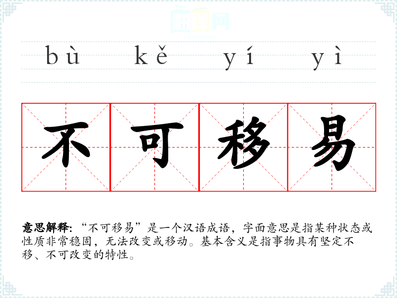 “不可移易”是一个汉语成语,字面意思是指某种状态或性质非常稳固,无法改变或移动。基本含义是指事物具有坚定不移、不可改变的特性。