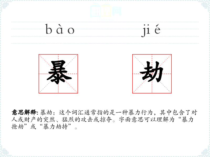 暴劫:这个词汇通常指的是一种暴力行为,其中包含了对人或财产的突然、猛烈的攻击或掠夺。字面意思可以理解为“暴力抢劫”或“暴力劫持”。