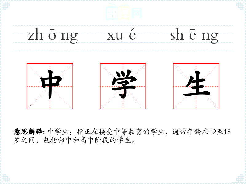 中学生:指正在接受中等教育的学生,通常年龄在12至18岁之间,包括初中和高中阶段的学生。