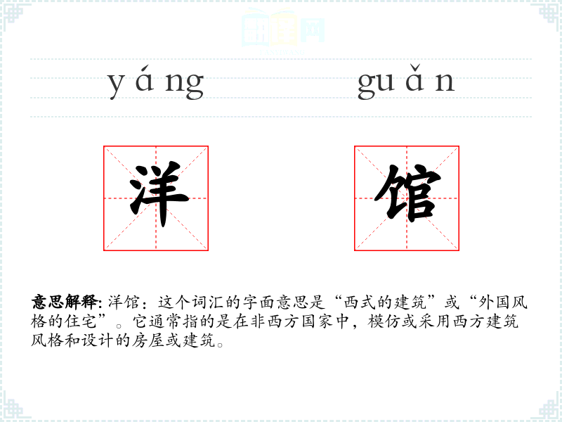 洋馆:这个词汇的字面意思是“西式的建筑”或“外国风格的住宅”。它通常指的是在非西方国家中,模仿或采用西方建筑风格和设计的房屋或建筑。