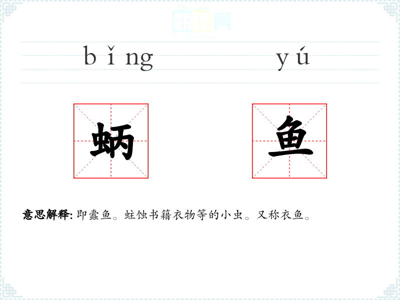 即蠹鱼。蛀蚀书籍衣物等的小虫。又称衣鱼。