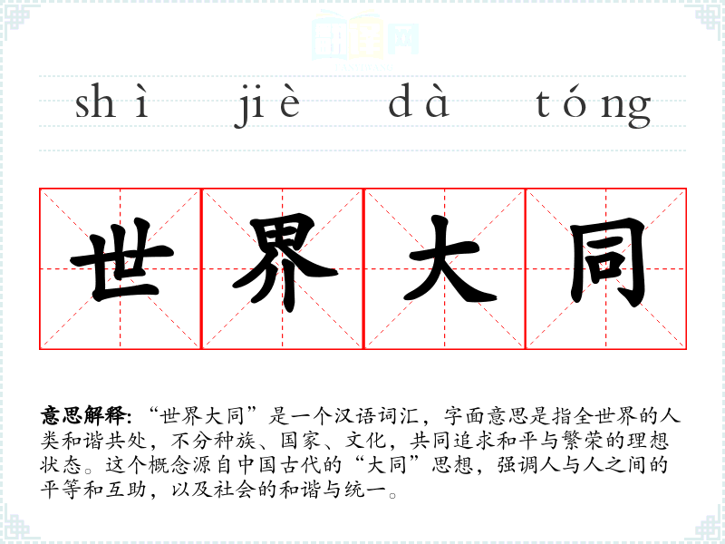“世界大同”是一个汉语词汇,字面意思是指全世界的人类和谐共处,不分种族、国家、文化,共同追求和平与繁荣的理想状态。这个概念源自**古代的“大同”思想,强调人与人之间的平等和互助,以及社会的和谐与统一。