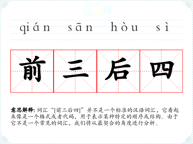 “前三后四”字面意思是指在前面的三个和后面的四个,可能用于描述顺序、位置或者数量。