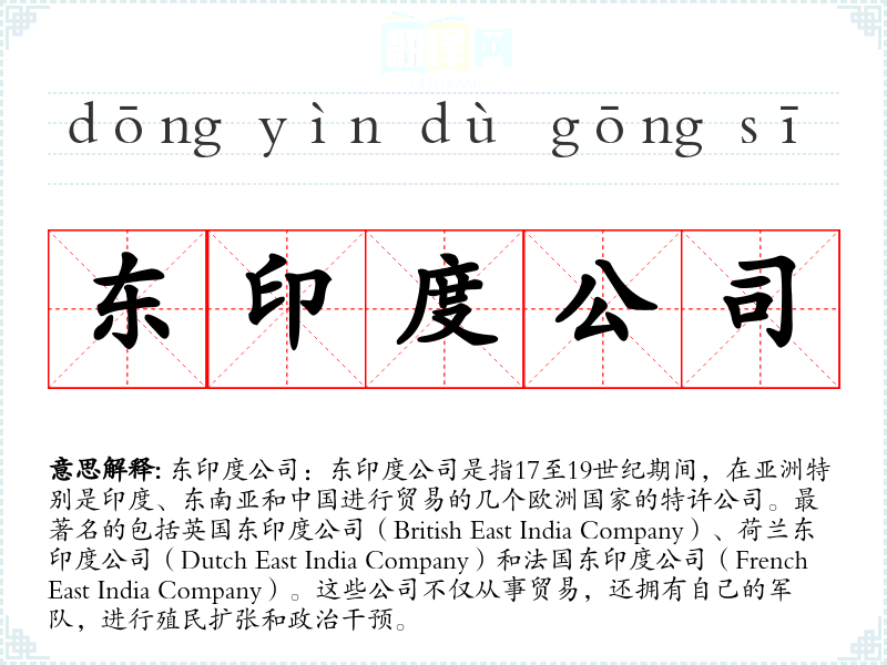 东印度公司一词源于17世纪,当时欧洲国家为了在亚洲进行贸易而成立了这些特许公司。随着时间的推移,这些公司在亚洲的势力范围不断扩大,直至19世纪末逐渐解体。