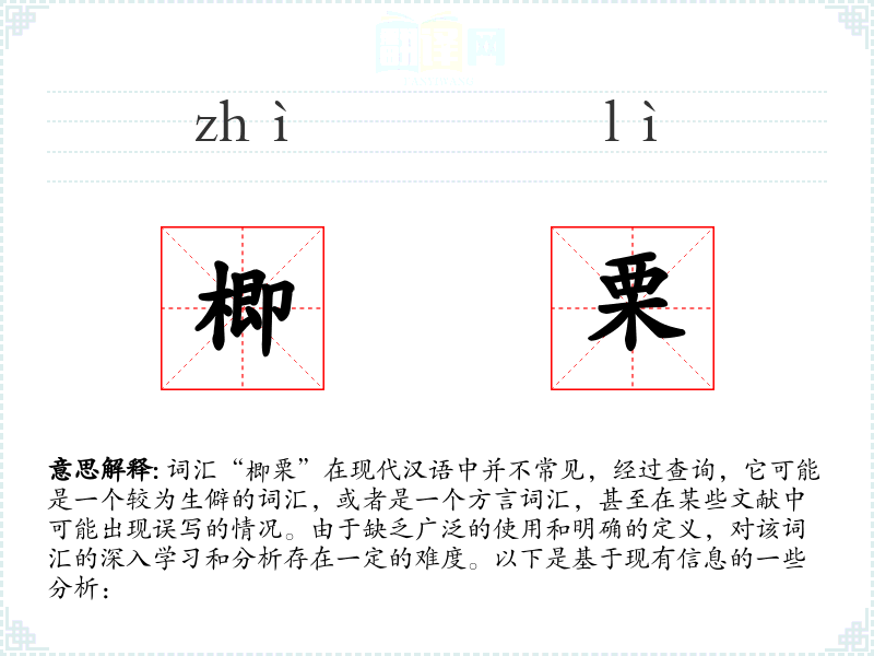 由于“楖栗”在现代汉语中并不常见,无法给出一个确切的基本定义。它可能是一个植物名称、地名或其他特定语境下的词汇。