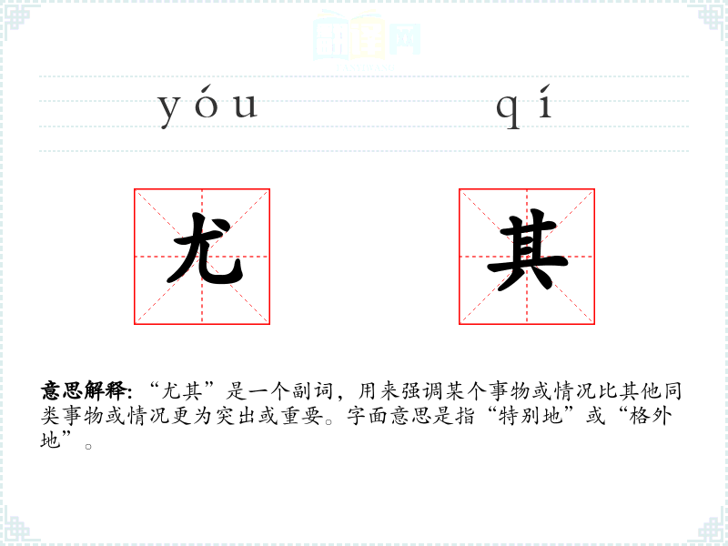 “尤其”是一个副词,用来强调某个事物或情况比其他同类事物或情况更为突出或重要。字面意思是指“特别地”或“格外地”。