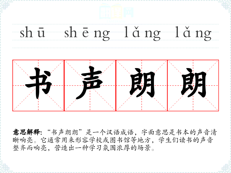 “书声朗朗”是一个汉语成语,字面意思是书本的声音清晰响亮。它通常用来形容学校或图书馆等地方,学生们读书的声音整齐而响亮,营造出一种学*氛围浓厚的场景。
