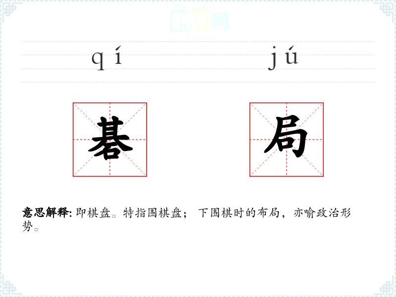 即棋盘。特指围棋盘; 下围棋时的布局,亦喻政治形势。