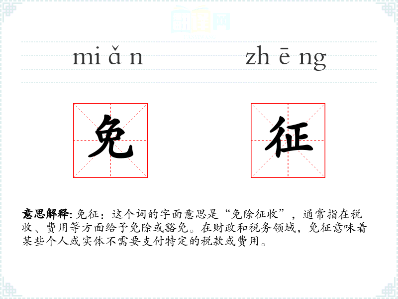 免征:这个词的字面意思是“免除征收”,通常指在税收、费用等方面给予免除或豁免。在财政和税务领域,免征意味着某些个人或实体不需要支付特定的税款或费用。