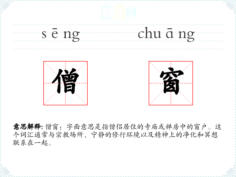 - 同义词:禅窗、佛窗(都指与**修行环境相关的窗户)