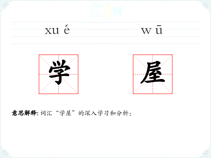“学屋”字面意思是指用于学的房屋或场所。基本含义通常指的是一个专门用于教育、学或研究的建筑物或空间。