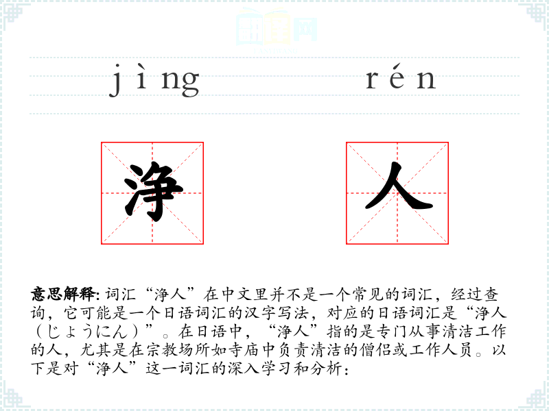 - 字面意思和基本含义:在日语中,“浄人”指的是专门负责清洁工作的人,特别是在**场所如寺庙中进行清洁的僧侣或工作人员。