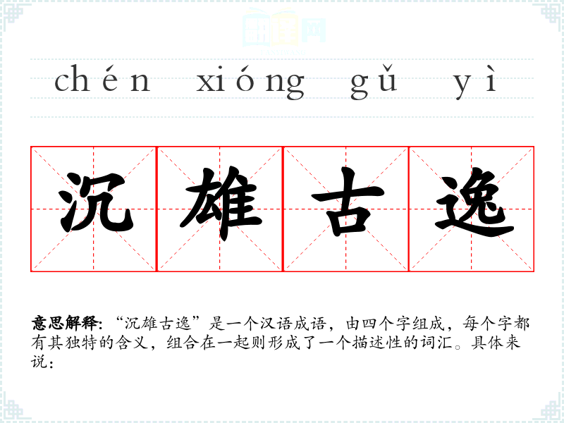 “沉雄古逸”是一个汉语成语,由四个字组成,每个字都有其独特的含义,组合在一起则形成了一个描述性的词汇。具体来说: