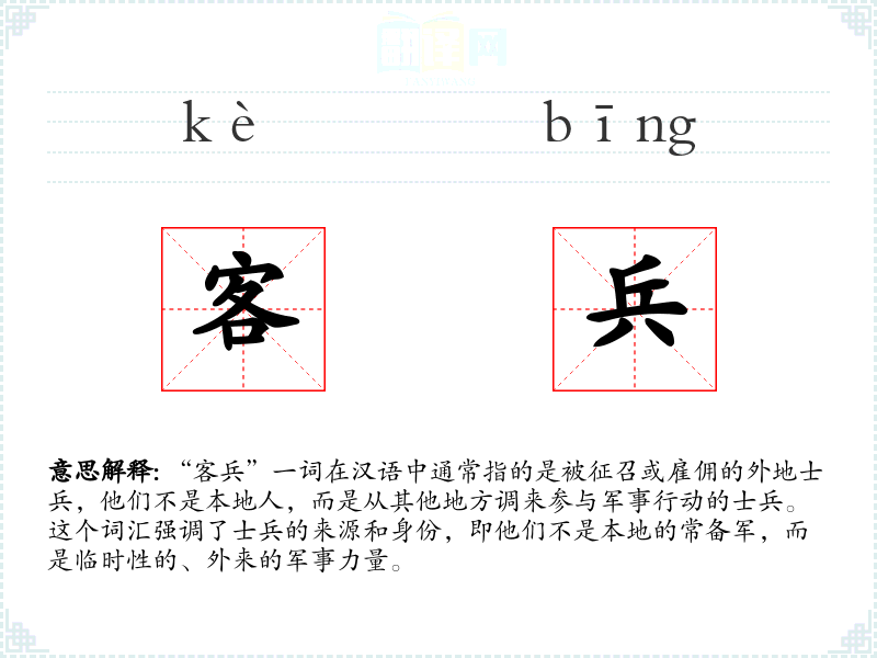 “客兵”一词在汉语中通常指的是被征召或雇佣的外地士兵,他们不是本地人,而是从其他地方调来参与军事行动的士兵。这个词汇强调了士兵的来源和身份,即他们不是本地的常备军,而是临时性的、外来的军事力量。