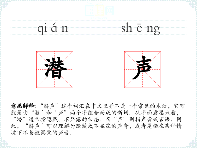 “潜声”这个词汇在中文里并不是一个常见的术语,它可能是由“潜”和“声”两个字组合而成的新词。从字面意思来看,“潜”通常指隐藏、不显露的状态,而“声”则指声音或言语。因此,“潜声”可以理解为隐藏或不显露的声音,或者是指在某种情境下不易被察觉的声音。