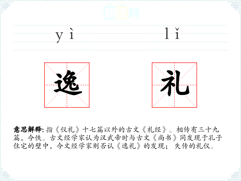 指《仪礼》十七篇以外的古文《礼经》。相传有三十九篇,今佚。古文经学家认为汉武帝时与古文《尚书》同发现于孔子住宅的壁中,今文经学家则否认《逸礼》的发现; 失传的礼仪。