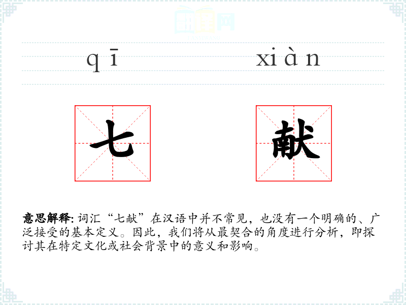 词汇“七献”在汉语中并不常见,也没有一个明确的、广泛接受的基本定义。因此,我们将从最契合的角度进行分析,即探讨其在特定文化或社会背景中的意义和影响。