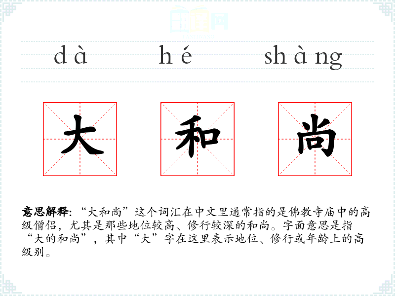 “大和尚”这个词汇在中文里通常指的是**寺庙中的高级僧侣,尤其是那些地位较高、修行较深的和尚。字面意思是指“大的和尚”,其中“大”字在这里表示地位、修行或年龄上的高级别。