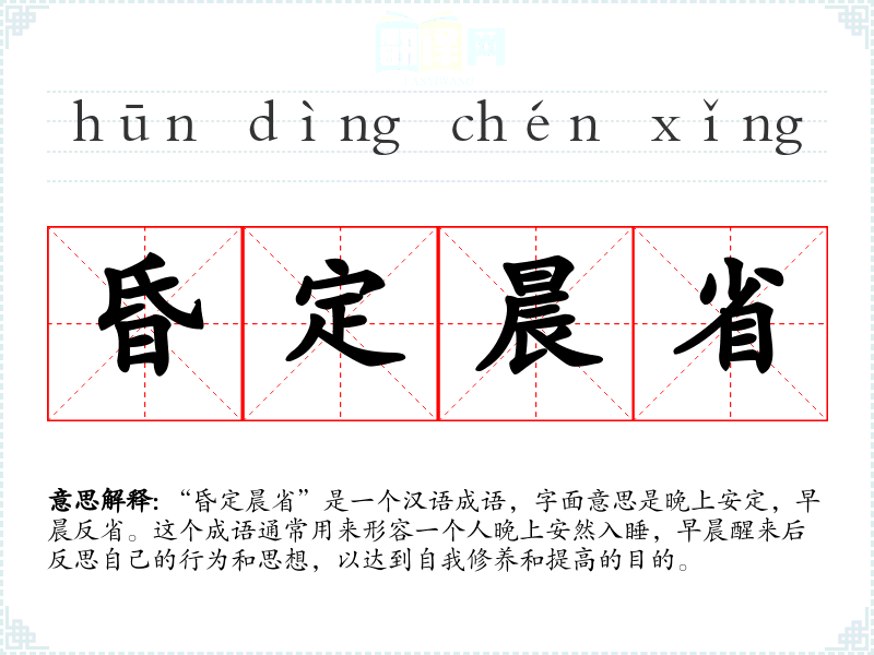 “昏定晨省”是一个汉语成语,字面意思是晚上安定,早晨反省。这个成语通常用来形容一个人晚上安然入睡,早晨醒来后反思自己的行为和思想,以达到自我修养和提高的目的。