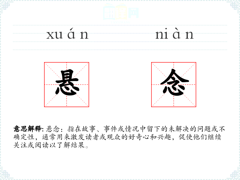 悬念:指在故事、**或情况中留下的未解决的问题或不确定性,通常用来激发读者或观众的好奇心和兴趣,促使他们继续关注或阅读以了解结果。