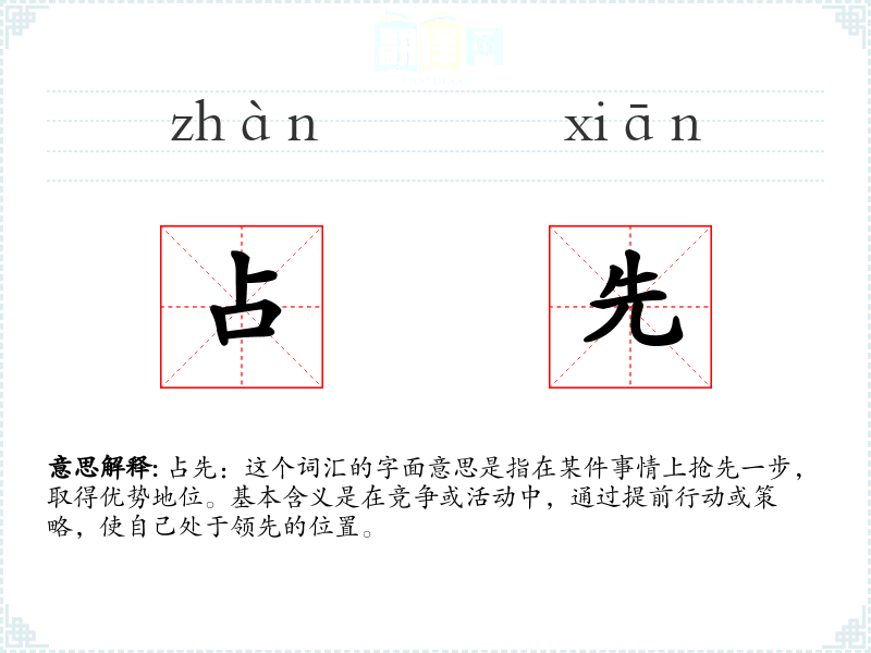 占先:这个词汇的字面意思是指在某件事情上抢先一步,取得优势地位。基本含义是在竞争或活动中,通过提前行动或策略,使自己处于领先的位置。