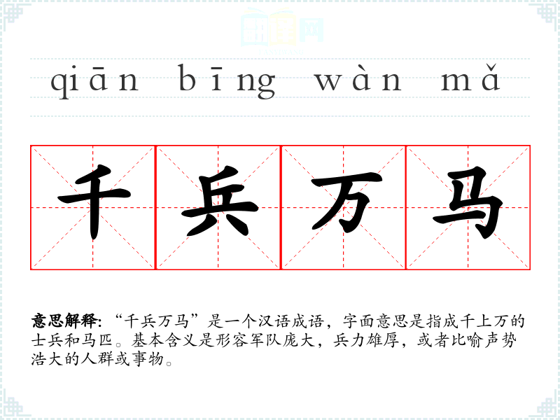“千兵万马”是一个汉语成语,字面意思是指成千上万的士兵和马匹。基本含义是形容军队庞大,兵力雄厚,或者比喻声势浩大的人群或事物。
