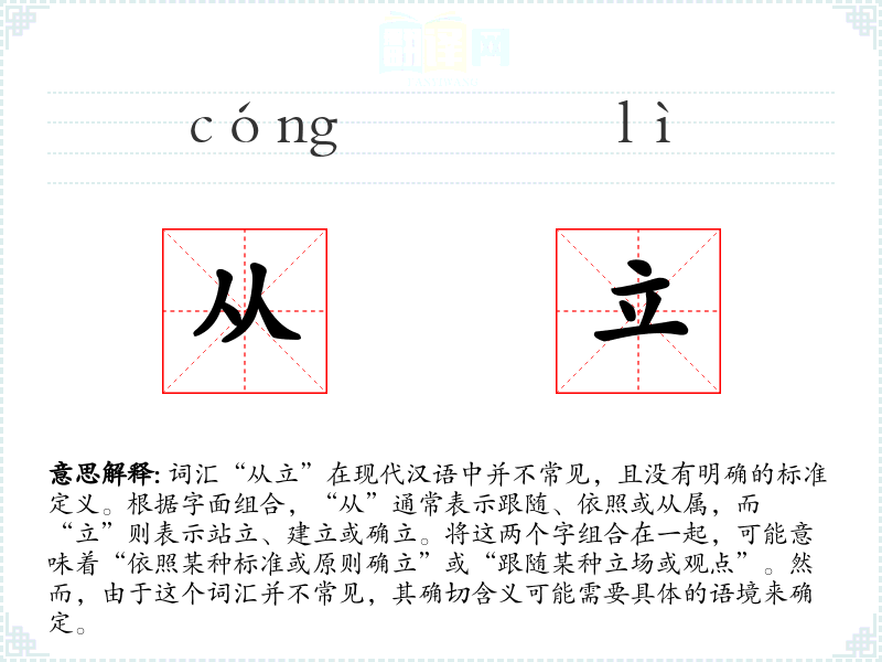词汇“从立”在现代汉语中并不常见,且没有明确的标准定义。根据字面组合,“从”通常表示跟随、依照或从属,而“立”则表示站立、建立或确立。将这两个字组合在一起,可能意味着“依照某种标准或原则确立”或“跟随某种立场或观点”。然而,由于这个词汇并不常见,其确切含义可能需要具体的语境来确定。