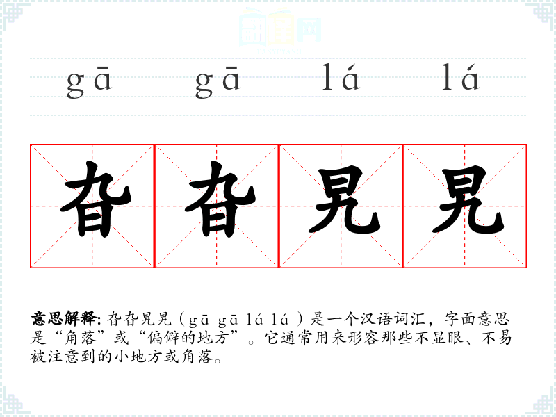 旮旮旯旯(gā gā lá lá)是一个汉语词汇,字面意思是“角落”或“偏僻的地方”。它通常用来形容那些不显眼、不易被注意到的小地方或角落。