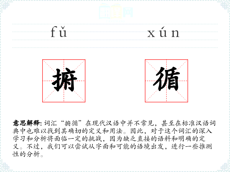 词汇“捬循”在现代汉语中并不常见,甚至在标准汉语词典中也难以找到其确切的定义和用法。因此,对于这个词汇的深入学习和分析将面临一定的挑战,因为缺乏直接的语料和明确的定义。不过,我们可以尝试从字面和可能的语境出发,进行一些推测性的分析。