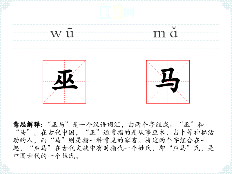在文学作品中,“巫马”可能被用来指代某个具体的历史人物或家族,尤其是在描述古代社会结构和家族关系的文献中。在口语中,这个词汇并不常见,除非是在讨论古代历史或姓氏学的时候。在专业领域,如历史学、姓氏学研究中,“巫马”可能被作为一个研究对象。