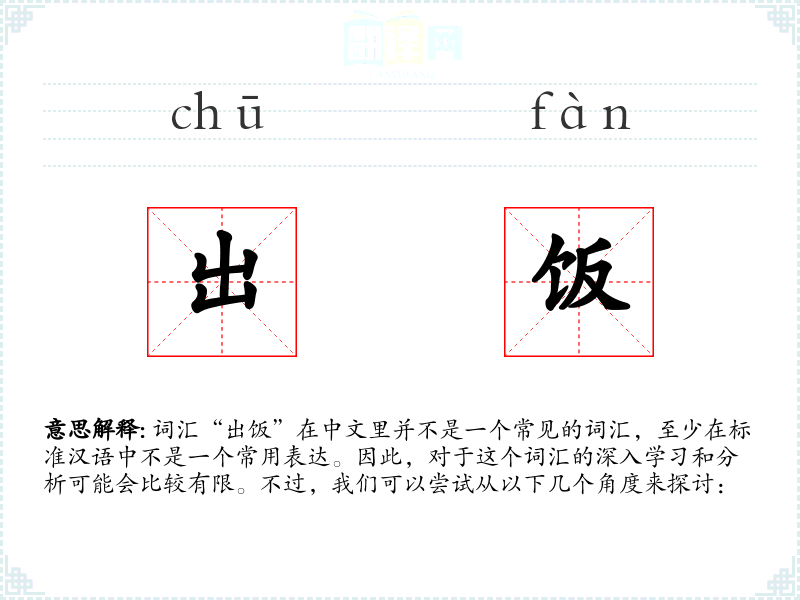 “出饭”这个词汇的字面意思可能是指“拿出饭”或“提供饭”。但在现代汉语中,这个词汇并不常见,可能需要结合具体语境来理解其确切含义。