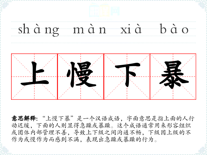“上慢下暴”是一个汉语成语,字面意思是指上面的人行动迟缓,下面的人则显得急躁或暴躁。这个成语通常用来形容组织或团体内部管理不善,导致上下级之间沟通不畅,下级因上级的不作为或慢作为而感到不满,表现出急躁或暴躁的行为。