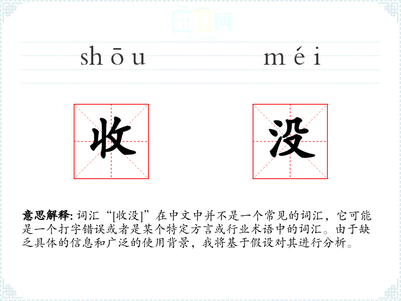 总结来说,“[收没]”可能是一个特定语境下的词汇,它的使用和理解需要具体的上下文支持。在标准汉语中,这个词汇可能并不常见,因此对其进行深入分析需要更多的信息和背景知识。
