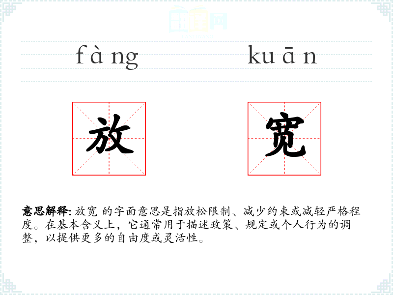 放宽 的字面意思是指放松限制、减少约束或减轻严格程度。在基本含义上,它通常用于描述政策、规定或个人行为的调整,以提供更多的自由度或灵活性。
