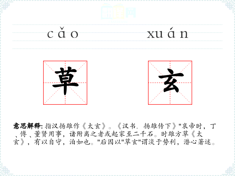 指汉扬雄作《太玄》。《汉书.扬雄传下》"哀帝时,丁﹑傅﹑董贤用事,诸附离之者或起家至二千石。时雄方草《太玄》,有以自守,泊如也。"后因以"草玄"谓淡于势利,潜心著述。