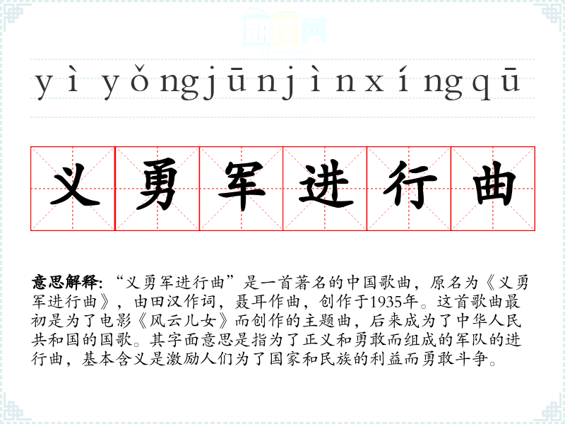 - 反义词:无(由于“义勇军进行曲”具有特定的历史和文化意义,很难找到直接的反义词)