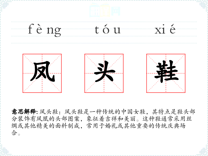 同义词:凤凰鞋、吉祥鞋 反义词:现代鞋、**鞋(这些词汇代表了与凤头鞋完全不同的风格和用途)
