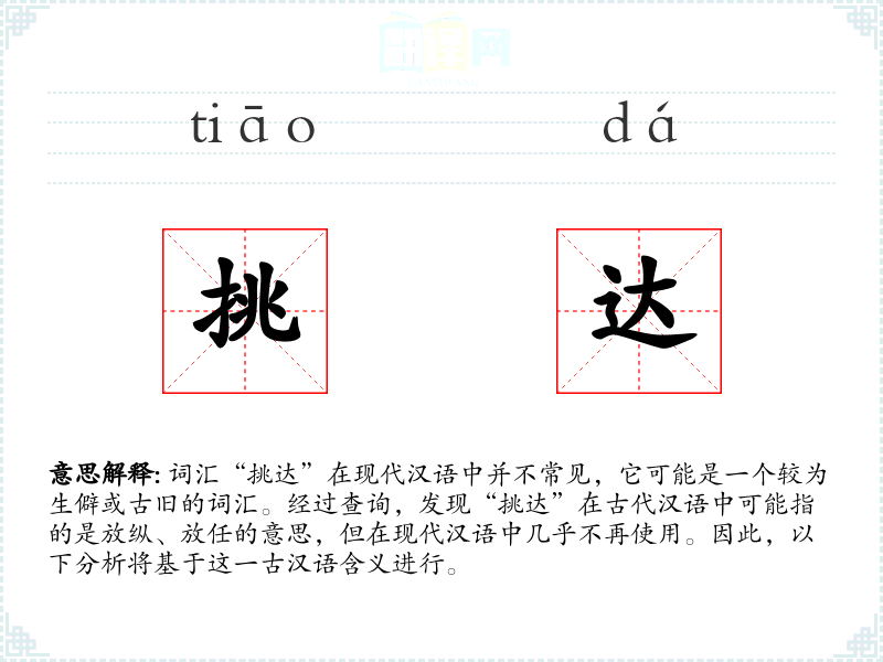 词汇“挑达”在现代汉语中并不常见,它可能是一个较为生僻或古旧的词汇。经过查询,发现“挑达”在古代汉语中可能指的是放纵、放任的意思,但在现代汉语中几乎不再使用。因此,以下分析将基于这一古汉语含义进行。